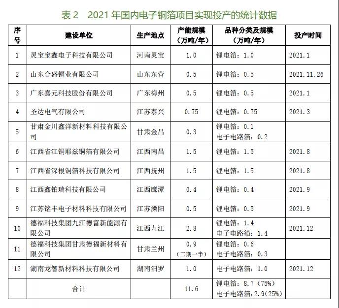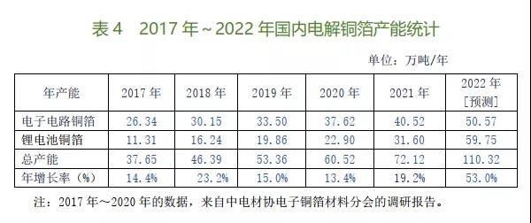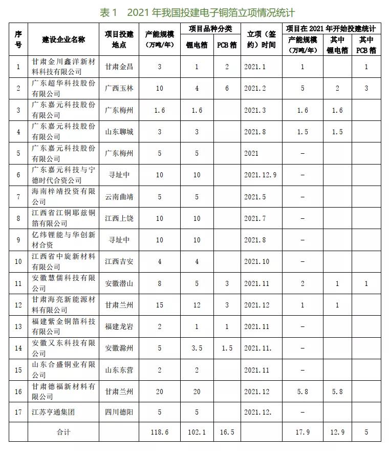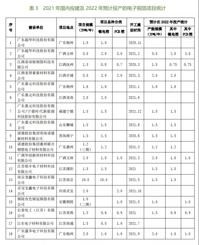 表3的統(tǒng)計(jì)數(shù)據(jù),是根據(jù)在2020~2021年開(kāi)工建設(shè)的進(jìn)度及計(jì)劃在2022年間實(shí)現(xiàn)投產(chǎn)的情況逐一調(diào)查(包括對(duì)30多家新投建銅箔廠家的問(wèn)卷調(diào)查,并以此反饋意見(jiàn)為準(zhǔn))所得到的。