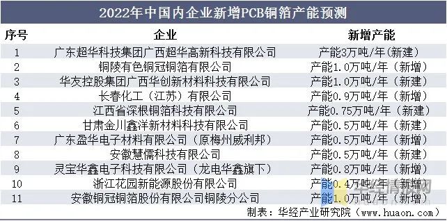 2022年中國內(nèi)企業(yè)新增PCB銅箔產(chǎn)能的預(yù)測(cè)